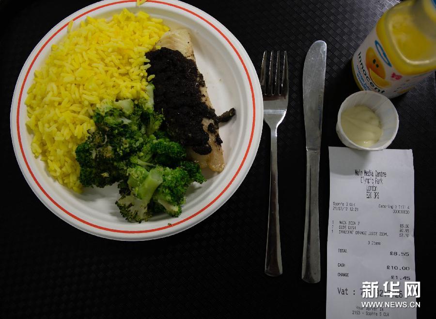 7月21日,在伦敦奥林匹克公园媒体餐厅,一份鱼肉加米饭蔬菜和一瓶饮料,共计8.55磅。奥林匹克公园媒体餐厅分为世界美食、英国美食、亚洲风味、地中海风味等几部分,价格基本与园外持平。新华社记者金立旺摄