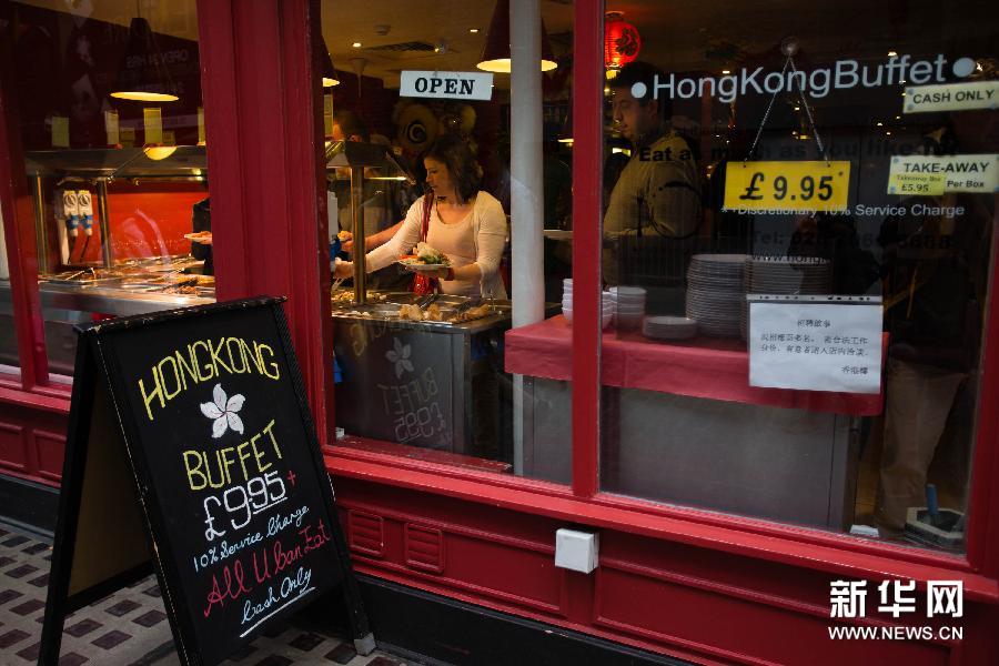 7月21日,在伦敦中国城一家自助中餐厅,人们正在取餐。新华社记者金立旺摄