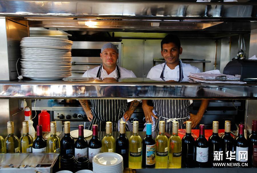 这是伦敦一家餐厅内的两名厨师(7月22日摄)。据该餐厅经理介绍,今年的营业额与去年同期相比下降了20%左右,主要原因是当地经济不景气。不过随着奥运会的临近,生意有所改善。新华社记者金立旺摄