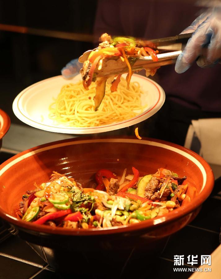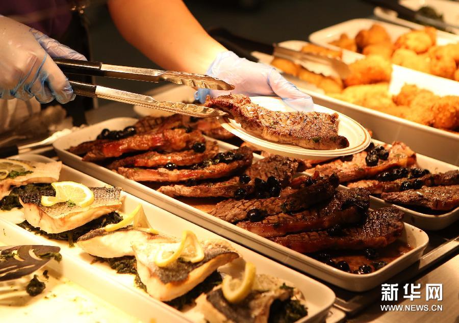 7月21日,在伦敦奥林匹克公园媒体餐厅,一名工作人员在出售食物。奥林匹克公园媒体餐厅分为世界美食、英国美食、亚洲风味、地中海风味等几部分,价格基本与园外持平。新华社记者孟永民摄
