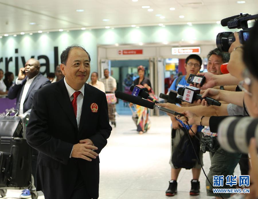 7月24日,中国体育代表团副团长肖天(左前)抵达希斯罗机场后接受采访。 当日,中国体育代表团团部一行飞抵伦敦。 新华社记者殷刚摄