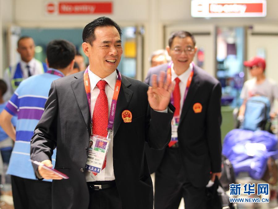 7月24日,中国体育代表团副团长蔡振华(左前)抵达希斯罗机场。 当日,中国体育代表团团部一行飞抵伦敦。 新华社记者殷刚摄
