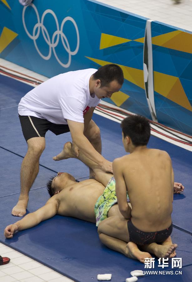 7月25日,邱波(中)在训练后进行拉伸放松。当日,中国跳水队在伦敦奥运会游泳比赛场馆——奥林匹克公园水上中心训练,备战奥运。新华社记者费茂华摄