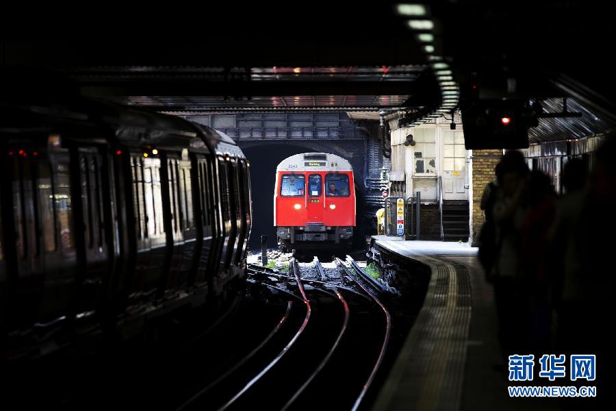 7月22日,一辆伦敦地铁驶进车站。 新华社记者费茂华摄