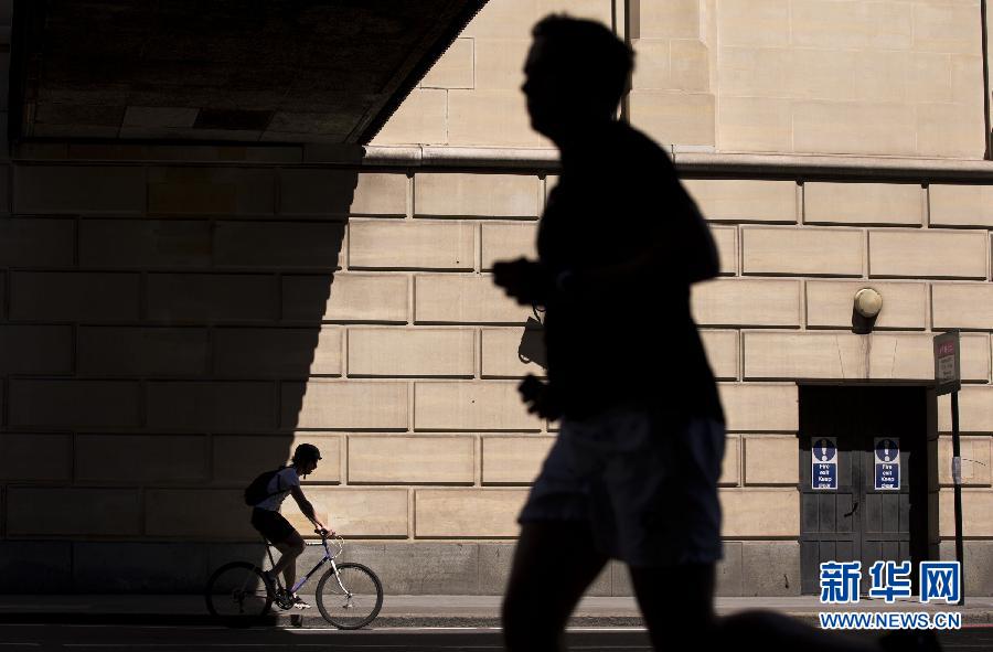 7月23日,一位骑自行车的伦敦市民和一位跑步的市民不期而遇。伦敦市政府鼓励市民骑自行车出行。 新华社记者费茂华摄