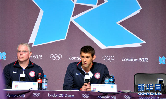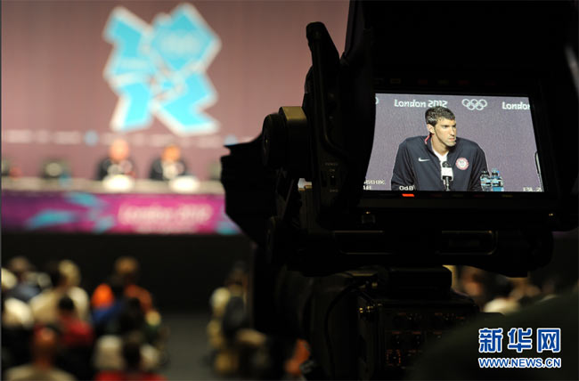 2012年7月26日,伦敦奥运会开幕在即:美国游泳队新闻发布会上游泳名将菲尔普斯显得极为自信,他表示,他和他的教练都认为自己是世界上最好的游泳运动员,对本届伦敦奥运也是信心满满。图为菲尔普斯在新闻发布会上。新华网 陈杰摄