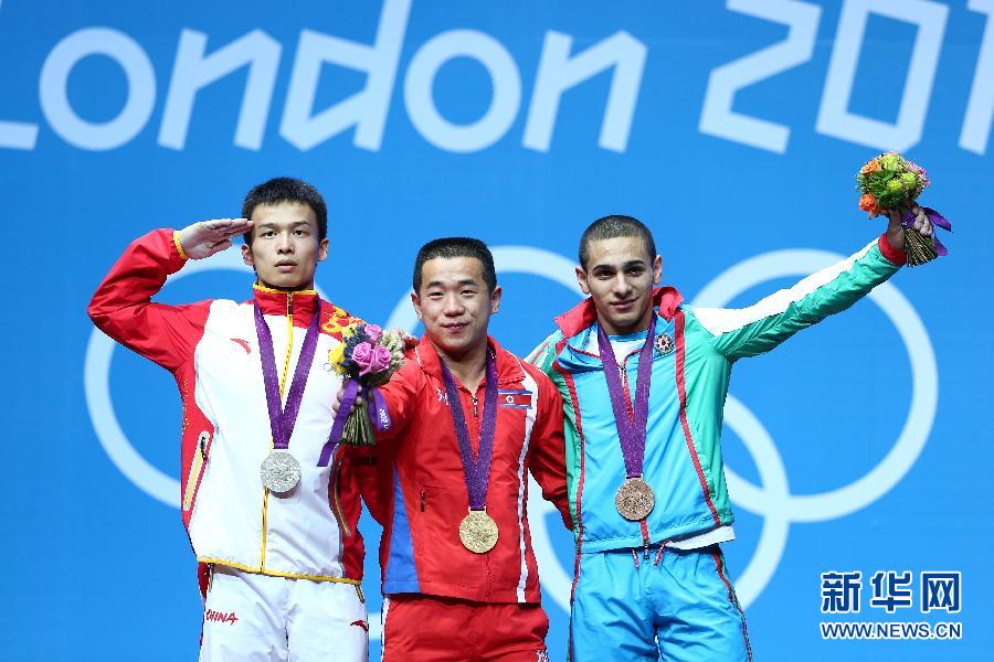 7月29日,严润哲(中)、吴景彪(左)和赫里斯托夫在颁奖仪式上。当日,在2012年伦敦奥运会举重男子56公斤级比赛中,朝鲜选手严润哲以293公斤的总成绩夺得冠军,中国选手吴景彪以289公斤的总成绩获得银牌,阿塞拜疆选手赫里斯托夫以286公斤的总成绩获得铜牌。新华社记者公磊摄
