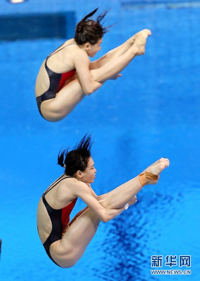 2012年7月29日,吴敏霞(下)/何姿在比赛中。当日,在伦敦奥运会跳水女子双人3米板决赛中,中国选手吴敏霞/何姿以346.20分的成绩夺冠。新华社记者凡军摄
