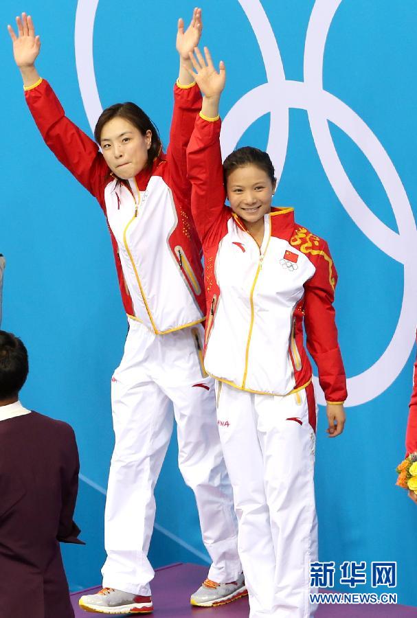 2012年7月29日 ,吴敏霞(左)、何姿在颁奖仪式上庆祝。当日,在伦敦奥运会跳水女子双人3米板决赛中,中国选手吴敏霞/何姿以346.20分的成绩夺冠。新华社记者凡军摄