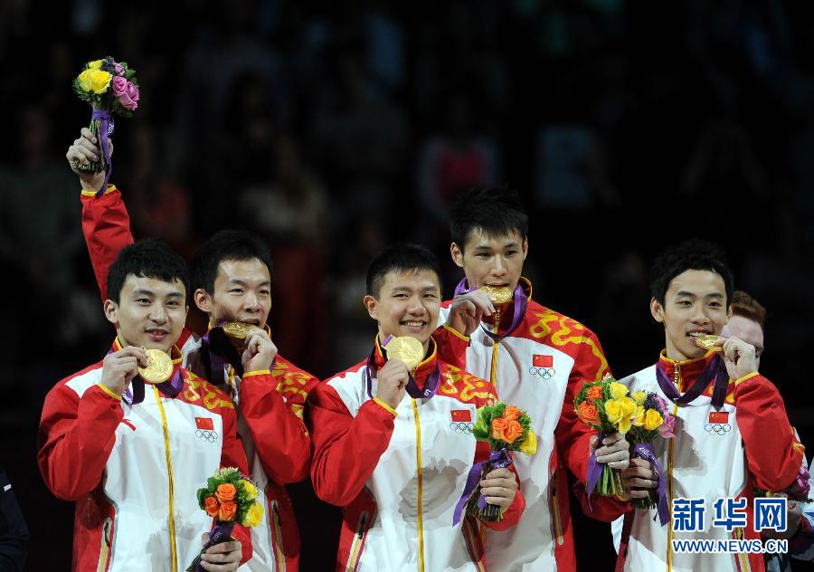 7月30日,中国队在颁奖仪式上。当日,在2012年伦敦奥运会体操男子团体决赛中,中国队以275.997的总分摘得金牌,成功卫冕。日本队和英国队分别以271.952分的271.711分的总成绩获得银牌和铜牌。新华社记者王建华摄