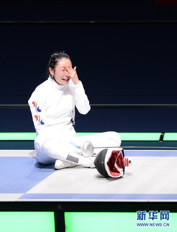 7月30日,韩国选手申雅岚在伦敦奥运会女子个人重剑半决赛中对阵德国选手海德曼,由于决定胜负的一剑产生争议,被判输掉比赛的申雅岚在赛场痛哭,并拒绝离开。截至发稿时,技术官员仍在处理韩国代表团提出的上诉,申雅岚仍未离开。新华社记者曾毅摄