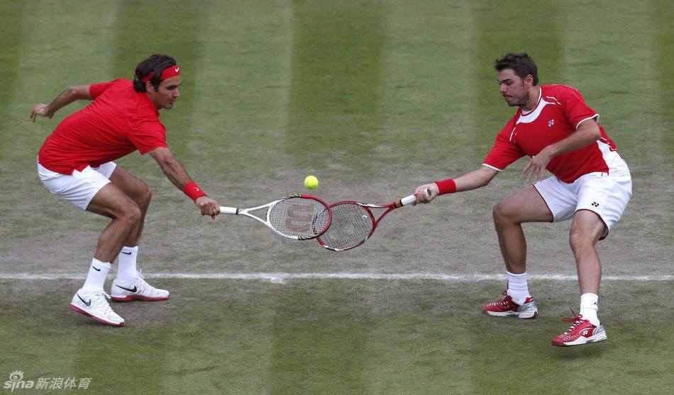 在一场网球男子双打比赛中,天王费德勒和队友瓦林卡没能心有灵犀,于是有了这滑稽的一幕,好在最终他们代表瑞士2-1击败了日本组合。