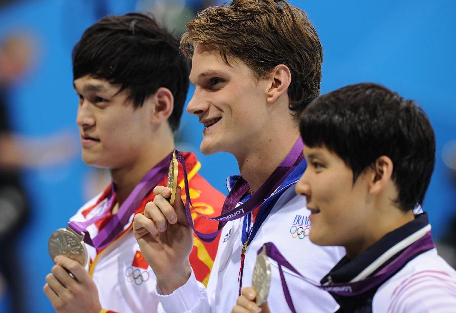 7月30日,中国选手孙杨(左)在颁奖仪式上。当日,在伦敦奥运会男子200米自由泳决赛中,中国选手孙杨和韩国选手朴泰桓以1分44秒93的成绩获得并列亚军。新华社记者刘大伟摄