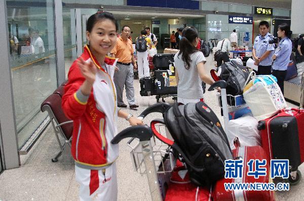 7月30日,伦敦奥运会中国首金得主易思玲(前)抵达首都国际机场。 当日下午,首批奥运健儿乘坐班机抵达北京首都国际机场,其中包括首金获得者易思玲、首铜得主喻丹,以及因伤不能参赛的体操选手滕海滨等。 新华社发