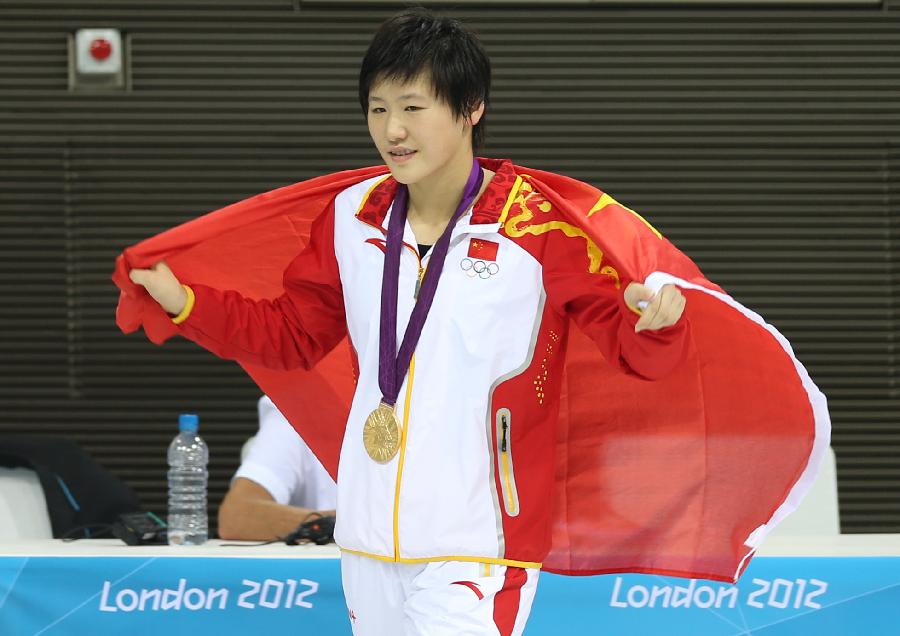 7月31日,叶诗文身披国旗。当日,在伦敦奥运会游泳女子200米个人混合泳决赛中,中国选手叶诗文以2分07秒57的成绩获得冠军,并创造新的奥运会纪录。新华社记者费茂华摄