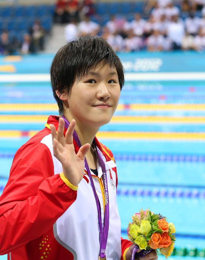7月31日,叶诗文向观众致意。当日,在伦敦奥运会游泳女子200米个人混合泳决赛中,中国选手叶诗文以2分07秒57的成绩获得冠军,并创造新的奥运会纪录。新华社记者凡军摄