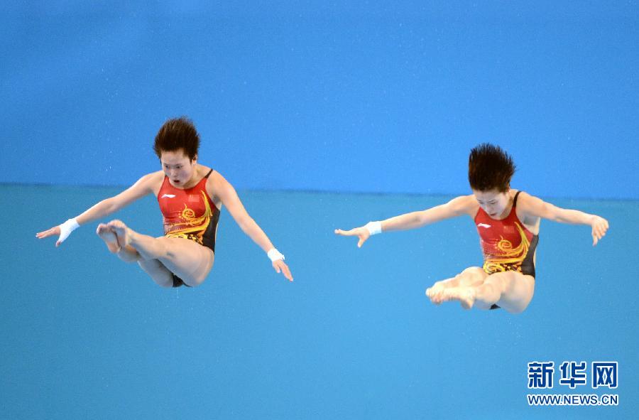 2012年7月31日,陈若琳/汪皓(右)在比赛中。当日,在伦敦奥运会女子双人10米跳台跳水决赛中,中国组合陈若琳/汪皓以368.40分的总成绩夺冠。新华社记者杨宗友摄