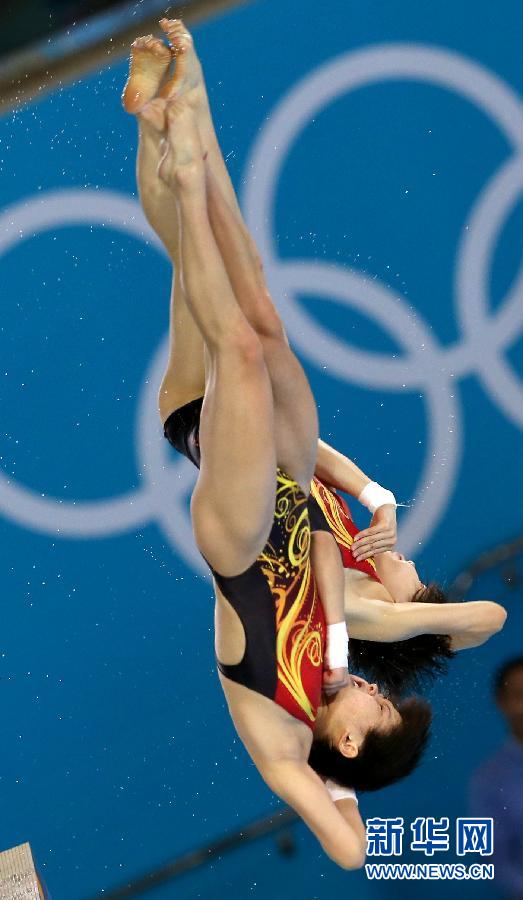 2012年7月31日,陈若琳/汪皓(后)在比赛中。当日,在伦敦奥运会女子双人10米跳台跳水决赛中,中国组合陈若琳/汪皓以368.40分的总成绩夺冠。新华社记者凡军摄