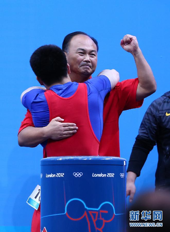 7月31日,中国选手林清峰(前)赛后与教练一同庆祝。当日,在伦敦奥运会举重男子69公斤级比赛中,中国选手林清峰以344公斤的总成绩夺得冠军。 新华社记者 陈建力 摄