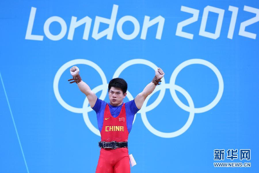 7月31日,中国选手林清峰庆祝夺冠。当日,在伦敦奥运会举重男子69公斤级比赛中,中国选手林清峰以344公斤的总成绩夺得冠军。 新华社记者 陈建力 摄