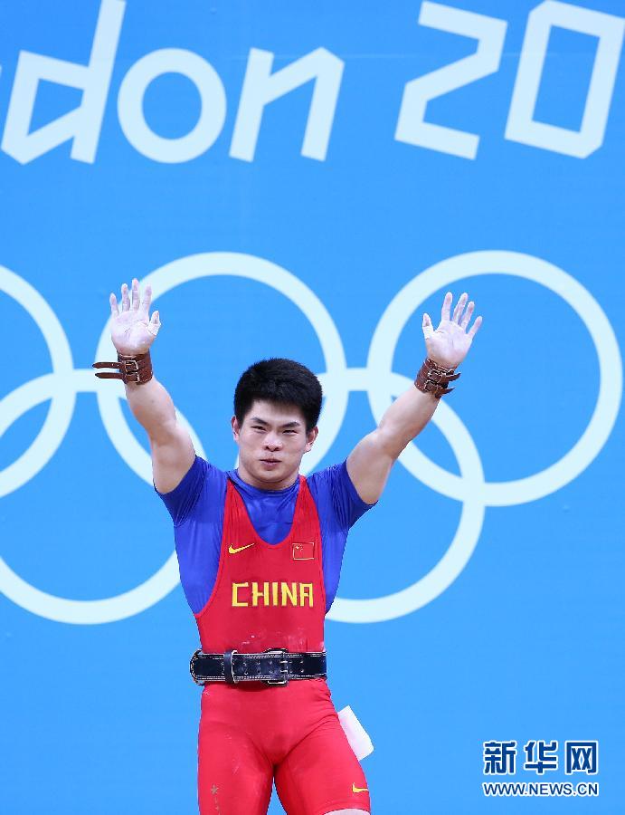 7月31日,中国选手林清峰庆祝夺冠。当日,在伦敦奥运会举重男子69公斤级比赛中,中国选手林清峰以344公斤的总成绩夺得冠军。 新华社记者 陈建力 摄