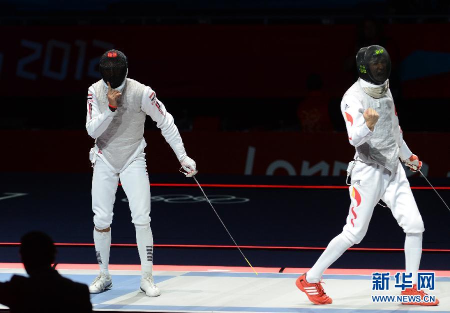 7月31日,中国选手雷声(右)在庆祝得分。当日,在伦敦奥运会击剑男子花剑个人决赛中,中国选手雷声击败埃及选手阿布卡西姆,夺得金牌。 新华社记者 曾毅 摄