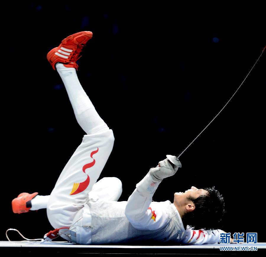 7月31日,中国选手雷声庆祝胜利。当日,在伦敦奥运会击剑男子花剑个人决赛中,中国选手雷声以15比13击败埃及选手阿布卡西姆,夺得金牌。 新华社记者 王毓国 摄