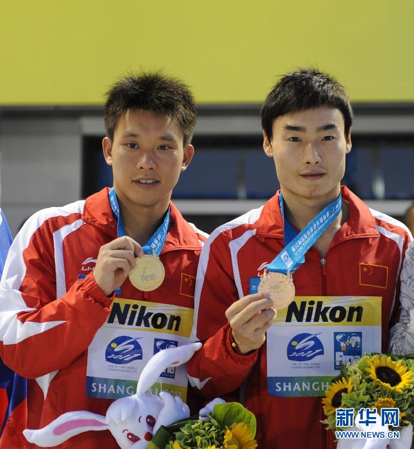 2012年8月1日,在伦敦奥运会男子双人3米板决赛中,中国选手秦凯/罗玉通以477.00分的成绩获得冠军。这是2011年7月19日,秦凯/罗玉通(左)在上海世界游泳锦标赛跳水男子双人3米板颁奖仪式上展示金牌。 新华社记者杨磊摄