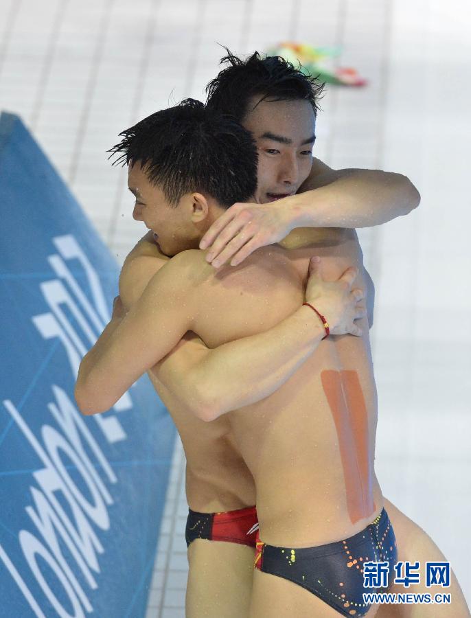2012年8月1日,在伦敦奥运会男子双人3米板决赛中,中国选手秦凯/罗玉通以477.00分的成绩获得冠军。图为2012年8月1日,中国选手秦凯(右)/罗玉通在获得伦敦奥运会男子双人3米板冠军后拥抱庆祝。 新华社记者刘大伟摄