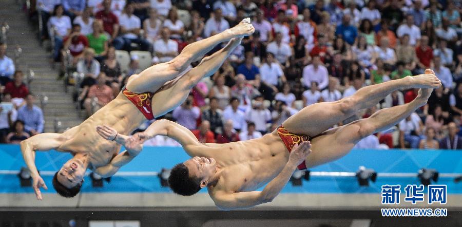 2012年8月1日,中国选手秦凯/罗玉通(右)在比赛中。当日,在伦敦奥运会男子双人3米板决赛中,中国选手秦凯/罗玉通以477.00分的成绩获得冠军。新华社记者刘大伟摄