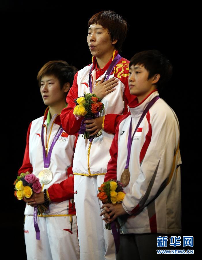 2012年8月1日,李晓霞(中)、丁宁(左)和冯天薇在颁奖仪式上。当日,在伦敦奥运会乒乓球女子单打决赛中,中国选手李晓霞以4比1战胜队友丁宁,夺得冠军,丁宁获亚军。新加坡选手冯天薇获得季军。新华社记者沈伯韩摄