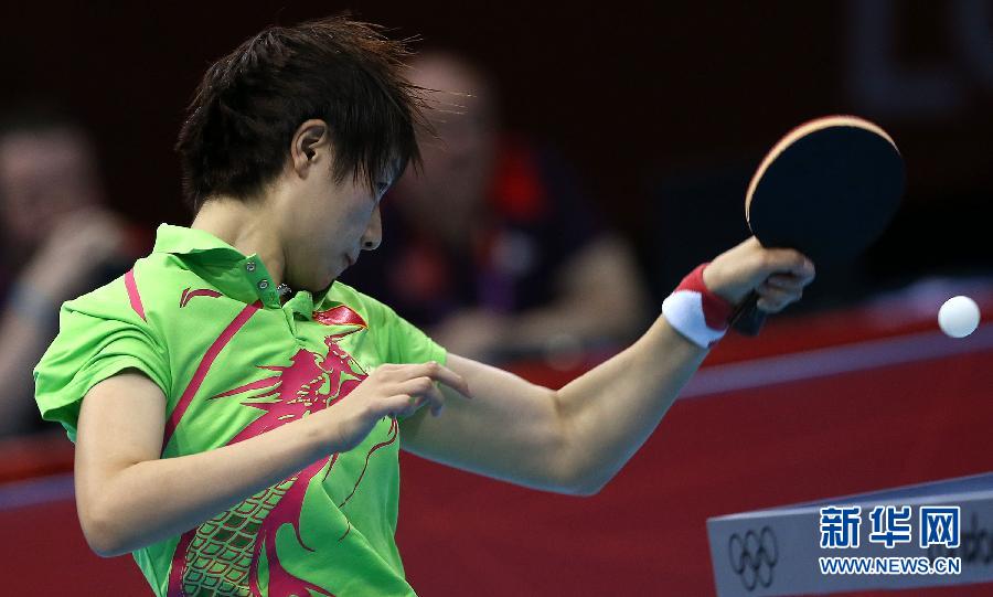 2012年8月1日,丁宁在比赛中回球。当日,在伦敦奥运会乒乓球女子单打决赛中,中国选手李晓霞迎战队友丁宁。 新华社记者沈伯韩摄