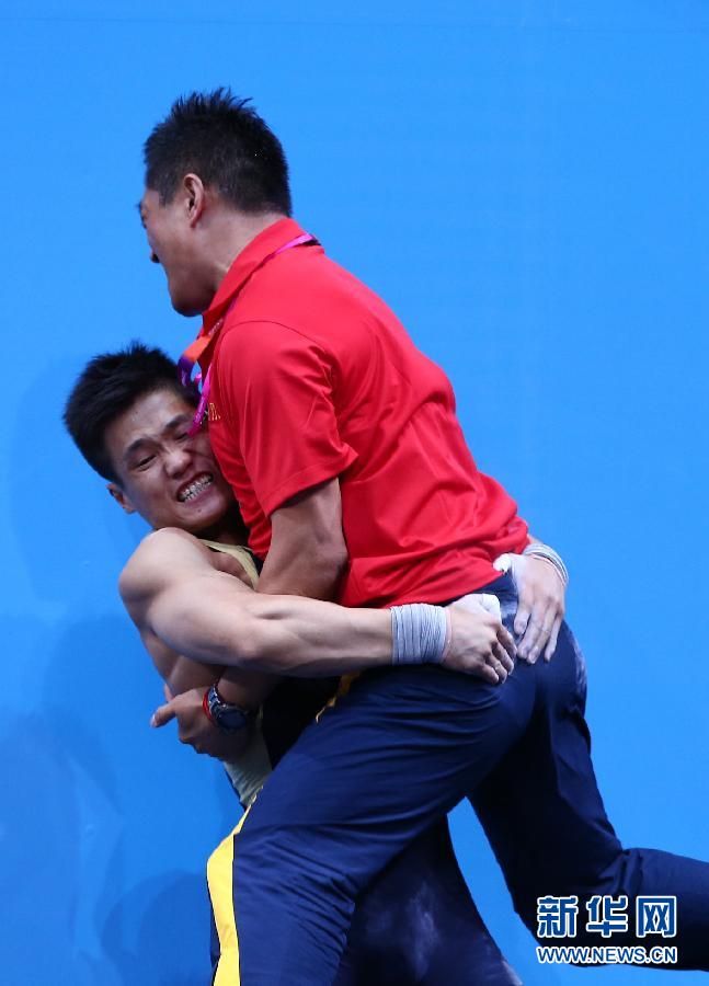 8月1日,中国选手吕小军(左)与教练庆祝胜利。当日,在2012年伦敦奥运会举重男子77公斤级的比赛中,中国选手吕小军以379公斤的总成绩夺金,并打破总成绩世界纪录。 新华社记者陈建力 摄
