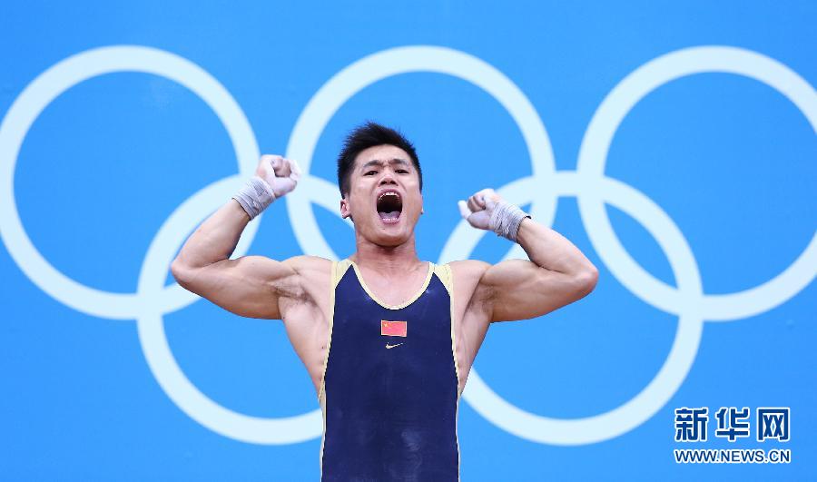 8月1日,中国选手吕小军夺冠后庆祝胜利。当日,在2012年伦敦奥运会举重男子77公斤级的比赛中,中国选手吕小军以379公斤的总成绩夺金,并打破总成绩世界纪录。 新华社记者陈建力 摄