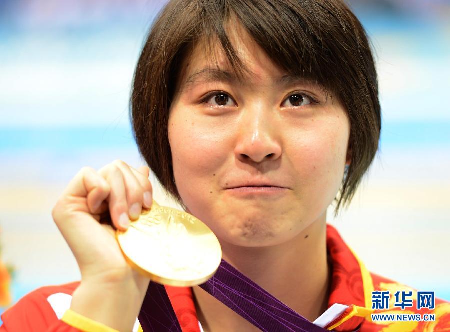 8月1日,中国选手焦刘洋在颁奖仪式结束后展示金牌。当日,在伦敦奥运会游泳女子200米蝶泳决赛中,焦刘洋以2分04秒06的成绩夺冠,并打破奥运会纪录。新华社记者杨宗友摄