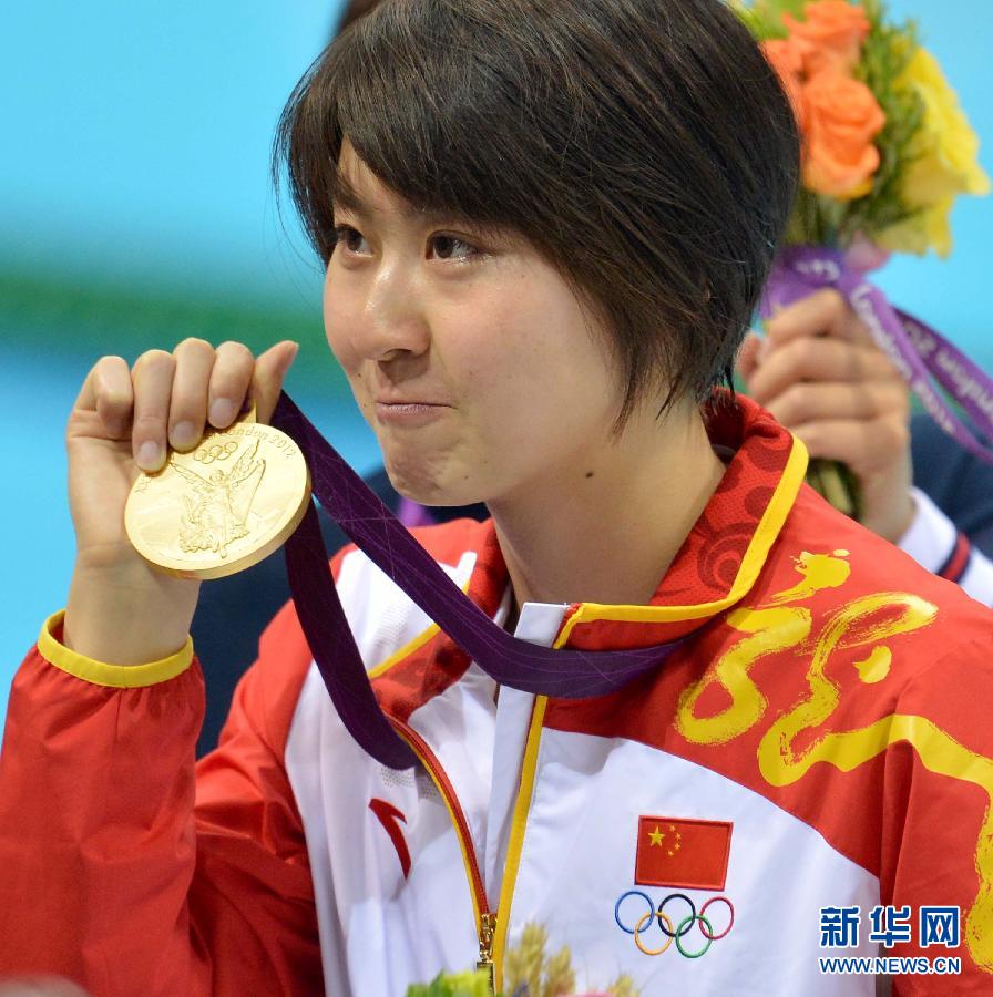 8月1日,中国选手焦刘洋在颁奖仪式结束后展示金牌。当日,在伦敦奥运会游泳女子200米蝶泳决赛中,中国选手焦刘洋以2分04秒06的成绩夺冠,并打破奥运会纪录。新华社记者刘大伟摄