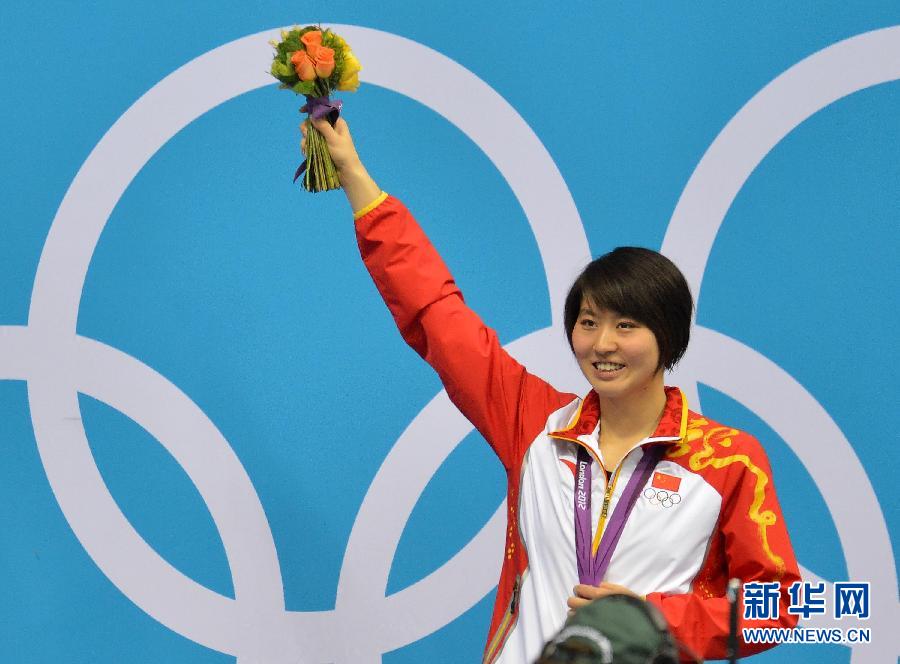 8月1日,中国选手焦刘洋在颁奖仪式上庆祝。当日,在伦敦奥运会游泳女子200米蝶泳决赛中,中国选手焦刘洋以2分04秒06的成绩夺冠,并打破奥运会纪录。新华社记者刘大伟摄