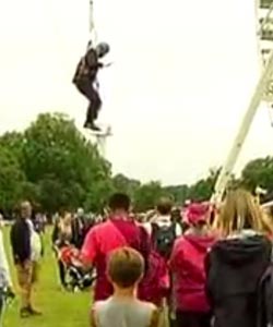 为庆贺英国队获得奥运会首枚金牌,伦敦市市长鲍里斯 约翰逊8月1日专程前往位于东伦敦的维多利亚花园玩“高空飞索”庆祝。
