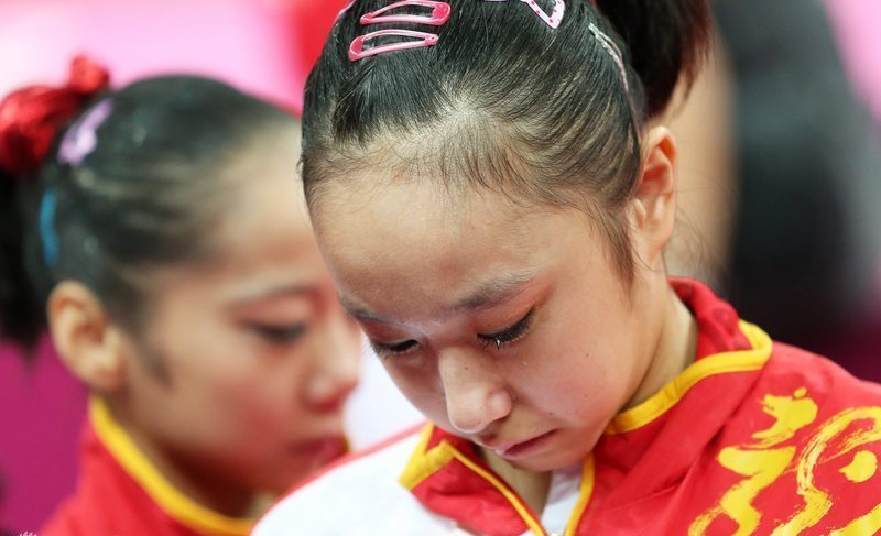 2012年7月31日,在伦敦奥运会体操女子团体决赛中,中国队以174.430分的成绩获得第四名。中国姑娘们泪洒赛场。