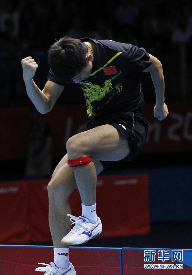 2012年8月2日,在伦敦奥运会乒乓球男子单打决赛中,中国选手张继科以4比1战胜队友王皓,获得冠军。图为,张继科在比赛结束后兴奋地越过场地护栏。新华社记者 沈伯韩 摄
