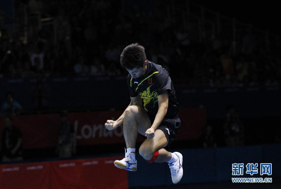 2012年8月2日,在伦敦奥运会乒乓球男子单打决赛中,中国选手张继科以4比1战胜队友王皓,获得冠军。图为,张继科在比赛结束后兴奋地越过场地护栏。新华社记者 沈伯韩 摄