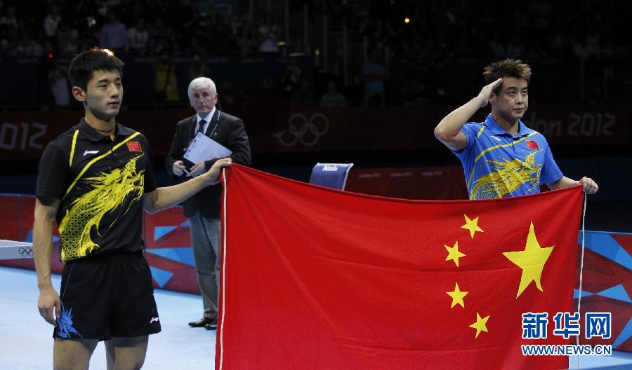 2012年8月2日,在伦敦奥运会乒乓球男子单打决赛中,中国选手张继科以4比1战胜队友王皓,获得冠军。图为,张继科(左)与王皓在比赛结束后向观众致意。新华社记者 沈伯韩 摄