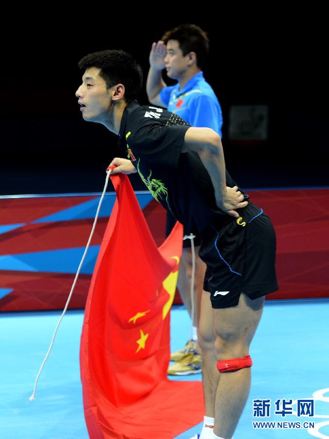 2012年8月2日,在伦敦奥运会乒乓球男子单打决赛中,中国选手张继科以4比1战胜队友王皓,获得冠军。图为,张继科(左)与队友王皓在赛后向观众致意。新华社记者 王毓国 摄