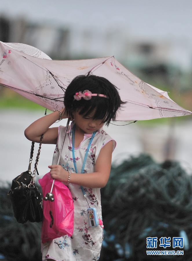 这是在台风“苏拉”登陆点秦屿镇,一名出行的小女孩撑着被风打坏的雨伞(8月3日摄)。 8月3日6时50分前后,台风“苏拉”在福建省福鼎市秦屿镇沿海登陆,登陆时中心附近最大风力10级(25米/秒)。预计“苏拉”将继续以每小时15公里左右的速度向西北方向移动,强度逐渐减弱。新华社记者 魏培全 摄