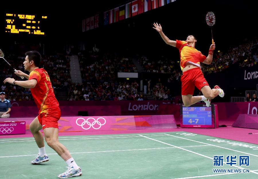 飞翔吧,风云!8月4日,蔡赟/傅海峰(右)在比赛中。当日,在伦敦奥运会羽毛球男双半决赛中,中国组合蔡赟/傅海峰以2比0战胜马来西亚组合古健杰/陈文宏,晋级决赛。 新华社发(唐诗摄)