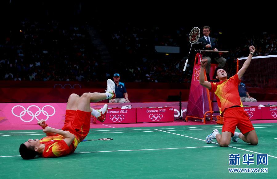 你们从来不缺少激情!8月4日,蔡赟(右)/傅海峰在获胜后庆祝。当日,在伦敦奥运会羽毛球男双半决赛中,中国组合蔡赟/傅海峰以2比0战胜马来西亚组合古健杰/陈文宏,晋级决赛。 新华社记者任正来摄