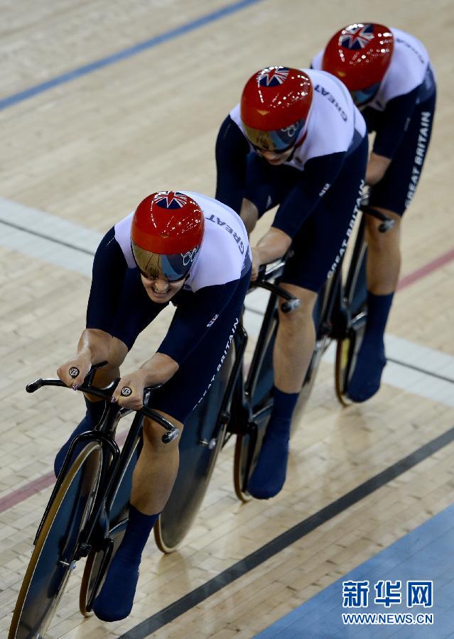 8月4日,英国队队员在比赛中。当日,在伦敦奥运会女子场地自行车团体追逐赛中,英国队以3分14秒051的成绩夺冠,并打破世界纪录。新华社记者王建华摄