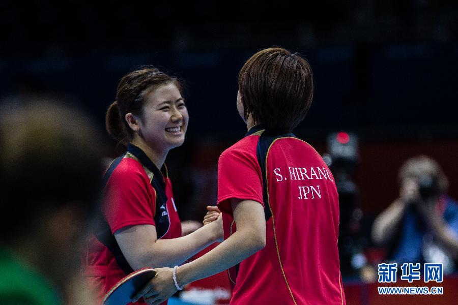 8月4日,日本队选手福原爱(左)获胜后露出笑容,与队友握手。当日,在2012年伦敦奥运会乒乓球女子团体四分之一决赛中,日本国队以3比0战胜德国队,晋级四强。 新华社记者 金立旺 摄