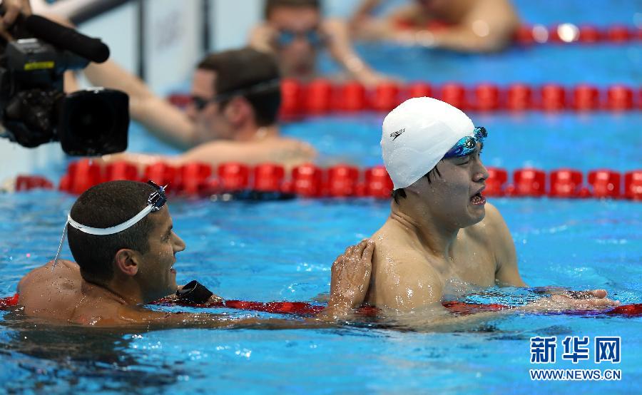 8月4日,中国选手孙杨(右)在获胜后难抑心中激动。当日,在2012伦敦奥运会男子1500米自由泳决赛中,中国选手孙杨以14分31秒02的成绩获得冠军,并打破世界纪录。新华社记者费茂华摄