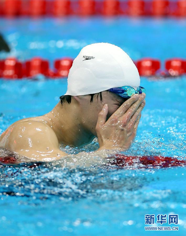 8月4日,中国选手孙杨在获胜后难抑心中激动。当日,在2012伦敦奥运会男子1500米自由泳决赛中,中国选手孙杨以14分31秒02的成绩获得冠军,并打破世界纪录。新华社记者费茂华摄